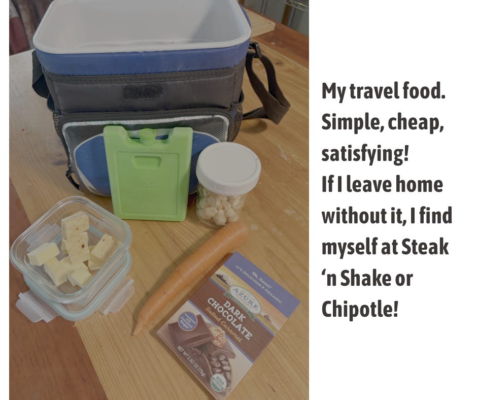 🥝 Pack a lunch/snack. I live an hour drive from everything so I always pack a snack: cubed cheese, a few macadamia nuts, dates, a carrot, a square of chocolate. Protein, carbs, fat. I always pack pretty much the same thing, simple and satisfying.